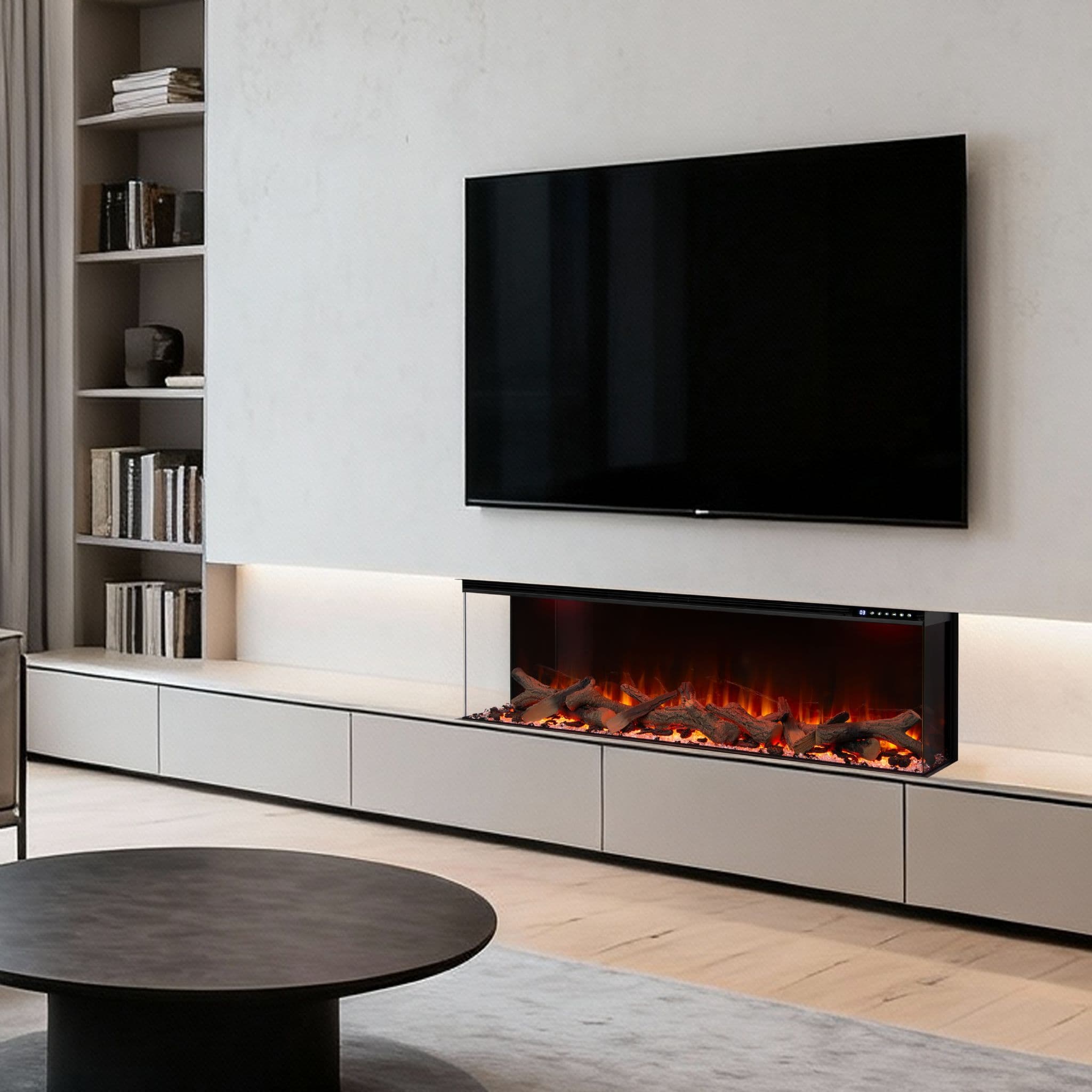 Introducing the Valenti 3D UHD Slimline Panoramic Electric Fire - the ultimate centrepiece for modern homes and media wall installations. With full-glass panoramic viewing and ultra-realistic flame depth, this fire delivers premium elegance and advanced smart control. Available in 50", 60", 72" and 80"